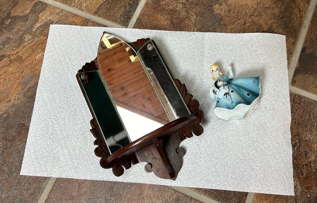 Three mirrors angles on the side provide full view. I think this was a wedding gift to Mel & Shirley. About 12″ tall